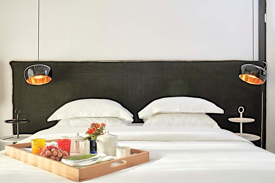 Stylish room with designer bathroom, luxury amenities and private balcony with panoramic sea view and hot tub on the terrace.