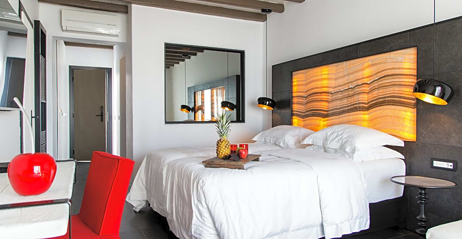 Luxurious and fashionably appointed guestroom, with designer bathroom and a fully furnished terrace offering amazing sea view of Elia Beach.